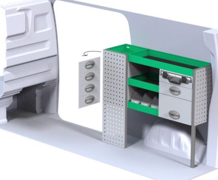 Liukuovesta taakse ulottuva hyllyratkaisu laatikostoin oikealle puolelle tavaratilaa, L1-korimalli. Käännettävissä 5-ovisiin autoihin vasemmalle puolelle. Valmistaja System Edström.